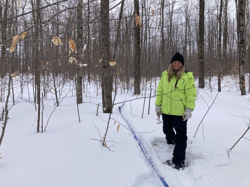 Jennifer RiChard picked her way through a web of bright blue plastic tubes in the woods one cold, snowy morning in late March.