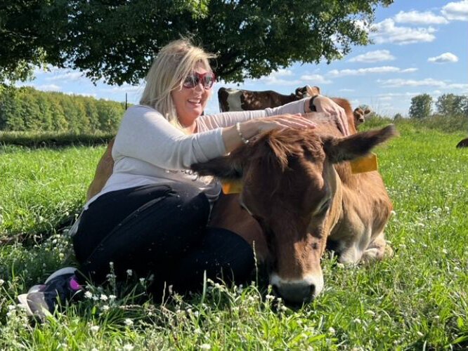 This mid-summer morning, Jackie greets her cow-cuddling guests outside the cheesemaking room and aging cave, not far from the milking stalls, swapping her food prep-perfect hair net for a jacket and boots, and inviting them into the fields to meet the celebrities behind the food.