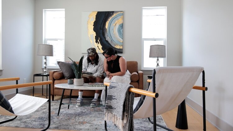 A couple relaxes on the couch reading in the living room of a staged CLT home at 2080 Union.