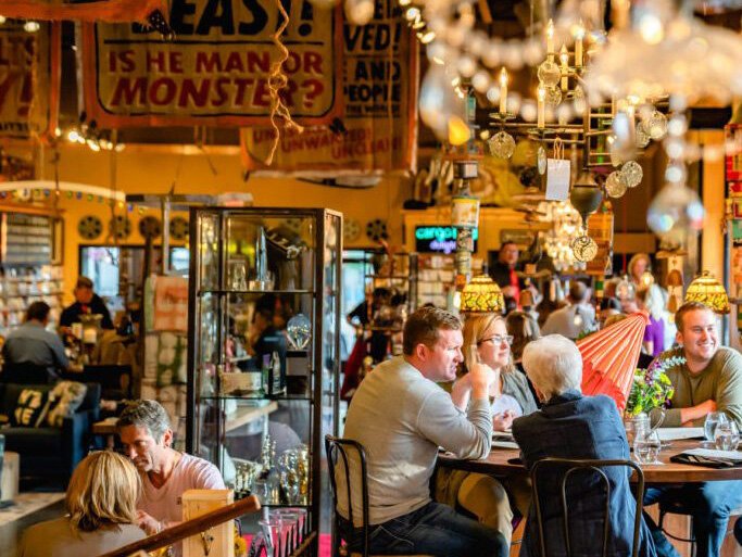 For a time, the theater space was used as an annex to Leon & Lulu but in 2019, Liz partnered with longtime Michigan restaurateur Patt Printice to open up the fun and eclectic Three Cats restaurant. The menu is diverse, with several vegan and vegetarian offerings, as well as an impressive wine list and a selection of all Michigan craft beers and spirits.