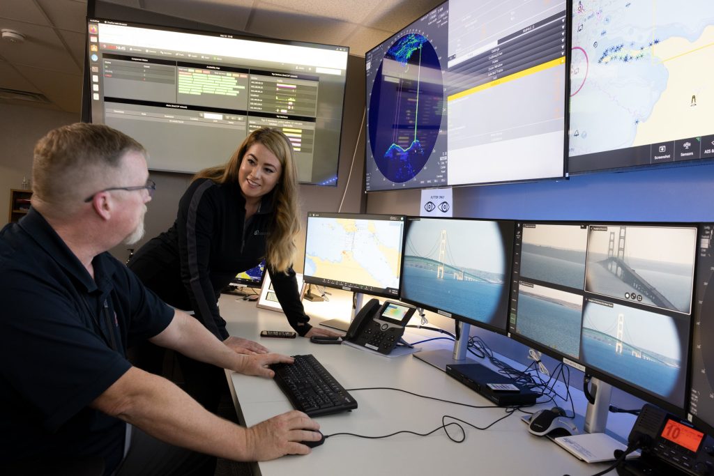 The team at the Enbridge Straits Maritime Operations Center oversees a variety of marine traffic safety systems designed to prevent an anchor strike on the dual pipelines – known as Line 5 – anchored to the lakebed of the Straits.