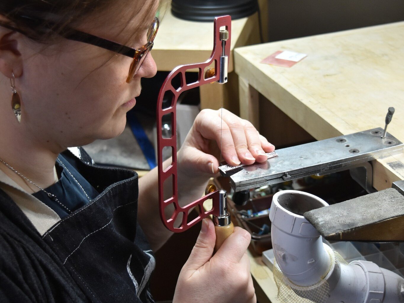 “I wasn’t sure what medium I wanted to focus on at first. I thought it might be painting because I love to paint, but I took a jewelry course where we learned metalsmithing,” she said. “We were working with saws, hammers and torches, which I really knew nothing about, but I liked it because I could draw my designs and then I got to work with physical objects after. I was hooked at that point and made metalsmithing my major.”