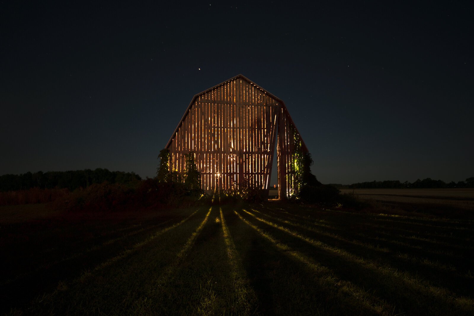 Newell, a Detroit-based artist and architect, carved a tall acute angle in the side of the barn. The structural modifications allow slivers of light to stretch from the barn across the field of the still-working farm.