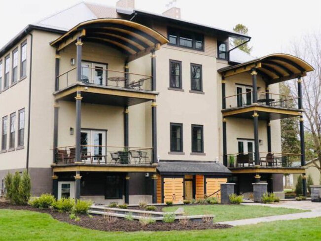 Both Dave and Eddie bring construction knowledge and abilities to the project, each dedicating 14 months to completing the major repurposing with a solid team of others by their side. The building was cleaned out and stripped down to the original brick and slowly the six former classrooms, with their hardwood floors and high ceilings, were reconfigured into modern and elegant guest suites. The open floorplans feature large kitchens with granite countertops and stainless-steel appliances adjacent to the living areas, each with a gas fireplace, televisions and heated floors.