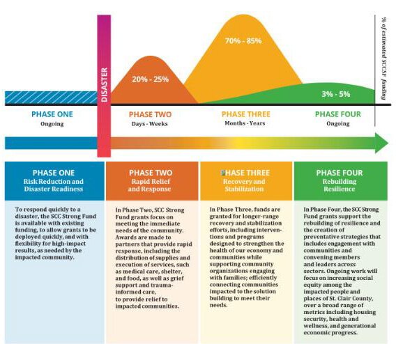 In setting up the fund, the Community Foundation spoke with their counterparts in Otsego and Midland counties for guidance based on the experience of their own crises. They also looked at programs throughout the country, modeling theirs largely on the four-phase approach from a community foundation in Hawaii.