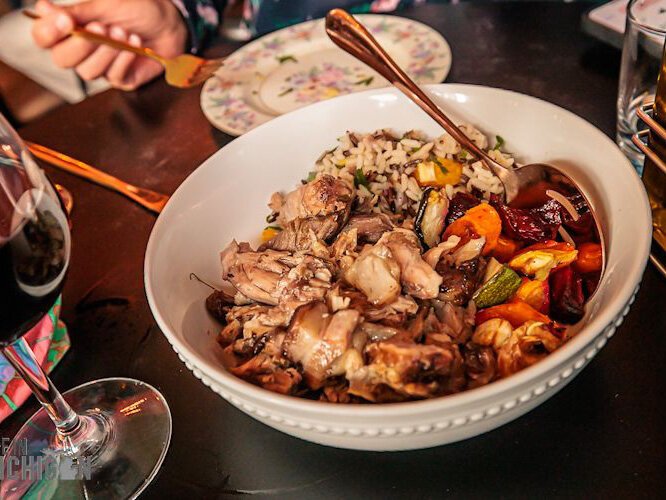 As the evening unfolds, the meat and final course is served — a red wine-braised pork shoulder infused with poultry herbs, raisins, citrus and served over a bed of wild rice. But that’s not all; a sampling of “Mama’s Chicken” also graces the table. This comforting dish is braised in white wine and adorned with olives, capers, and lemon zest, among a medley of other spices.