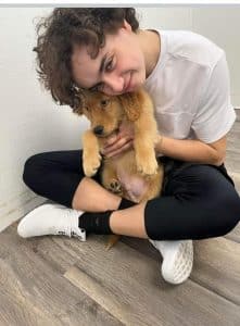 Ethan Dutter, known for his love of dogs, snuggles a puppy.