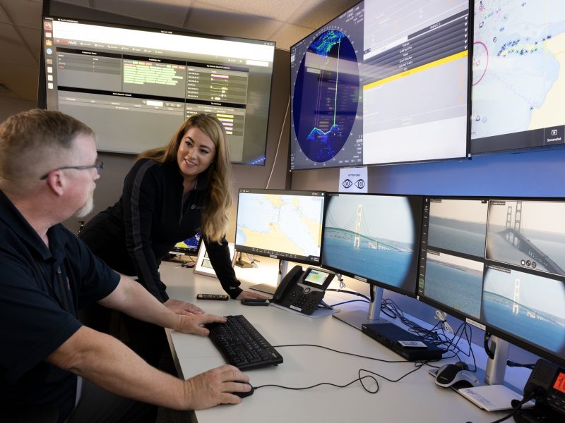 The Enbridge Straits Maritime Operations Center monitors ships passing through the Straits to make sure anchors are properly secured.