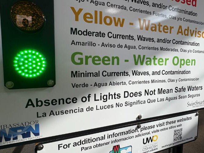 The SwimSmart signage has been a welcome addition to keep swimmers safe during and outside of life-guarding hours at North Beach in Manistee, says a lifeguard representative. “The lifeguards have unanimously agreed that this technology aids them in their ability to keep patrons safe and keep beach goers informed.”