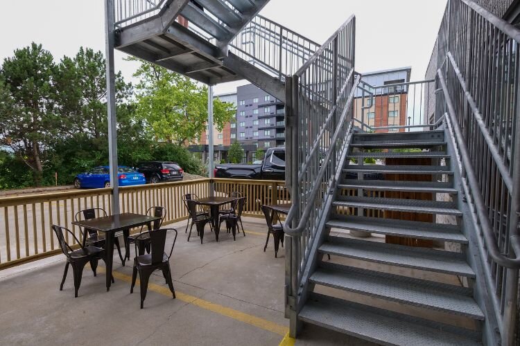 In the near future, new features will be added to the rooftop, including an electric dumbbell to transfer items upstairs, outdoor music, and televisions to watch Central Michigan University football games.